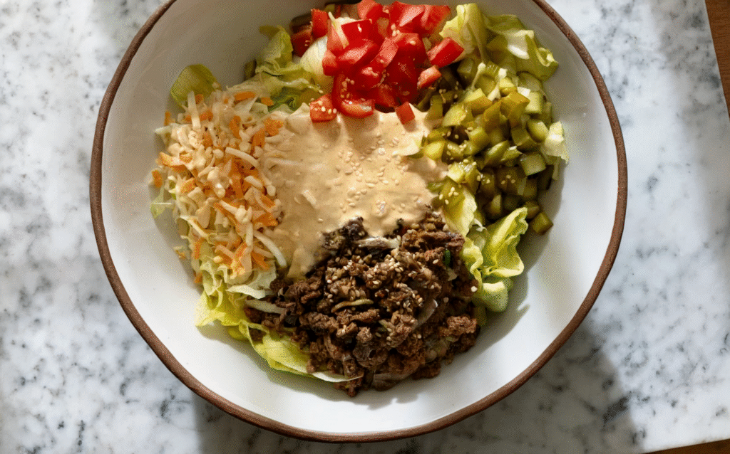 This salad gets all the classic Big Mac flavors right by layering seasoned ground beef, crisp lettuce, and a creamy, tangy dressing that mimics the iconic special sauce.