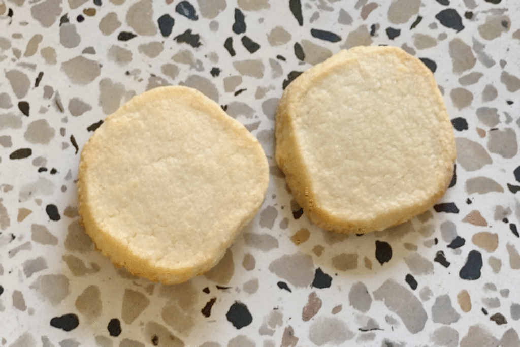 Bake one pan at a time for ~14-16 minutes, rotating the pan halfway through. The cookies are done when the edges are light golden brown but the centers are still pale.