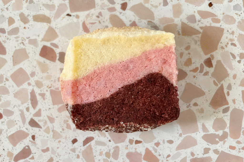 Stack one chocolate, one strawberry, and one vanilla piece on top of each other. Gently press them together. Pat and form the stack into a log about 2 inches wide and 8 inches long. This is a good time to shape it into a square if you prefer that over a round log.