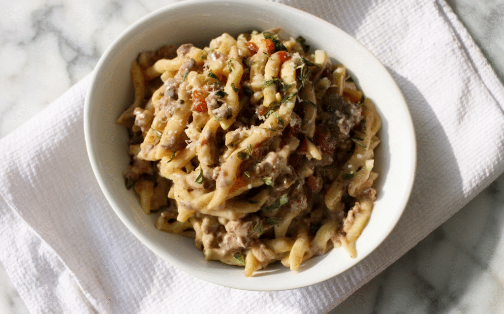 Add the pasta and beef stock to the pot and stir to combine. Cover and let the mixture simmer for ~8-10 minutes, or until the pasta is fully cooked and has absorbed most of the liquid.