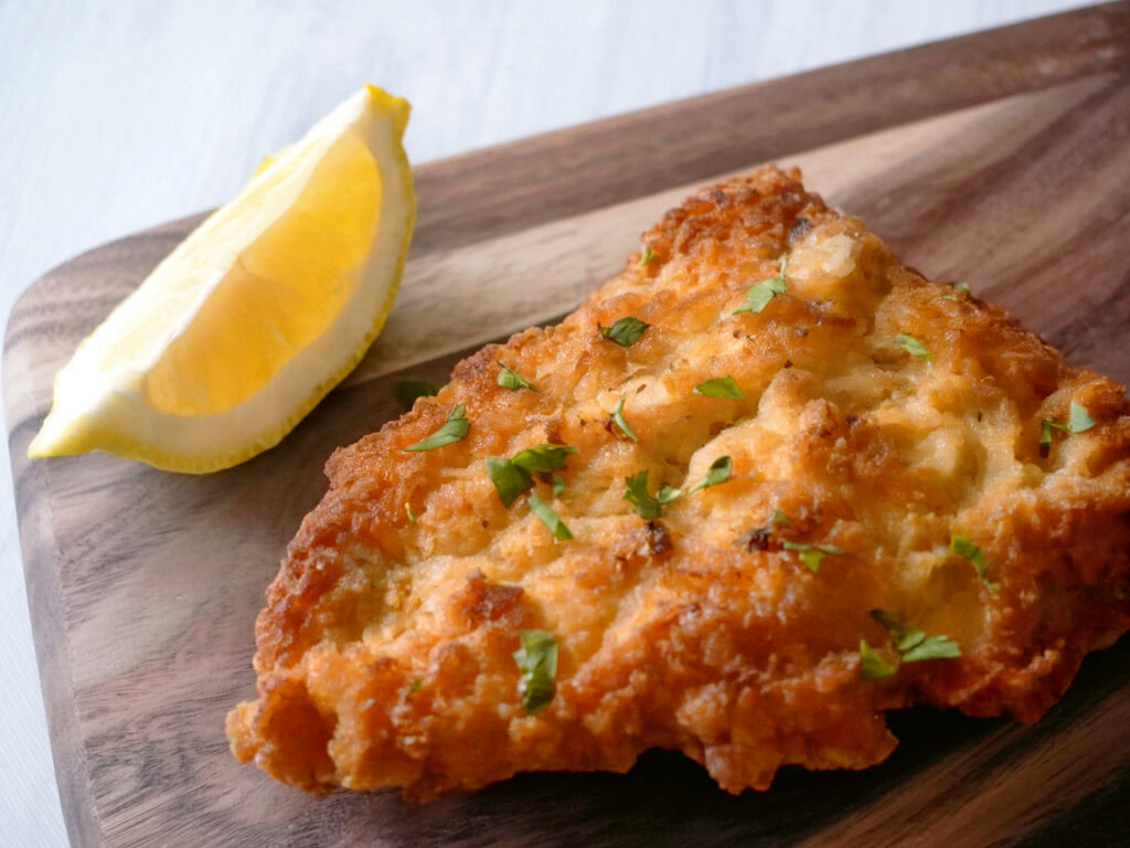 - Fry schnitzels in batches 3 min per side until golden brown and 145°F internal.