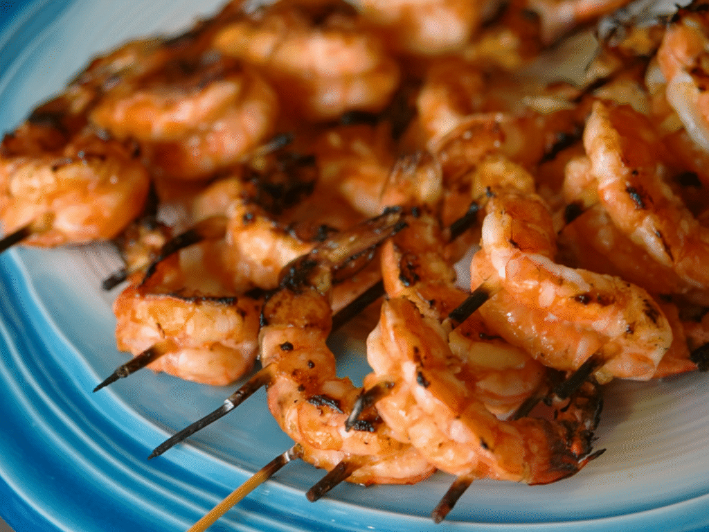 Thread shrimp onto skewers. Grill ~2-3 minutes per side.